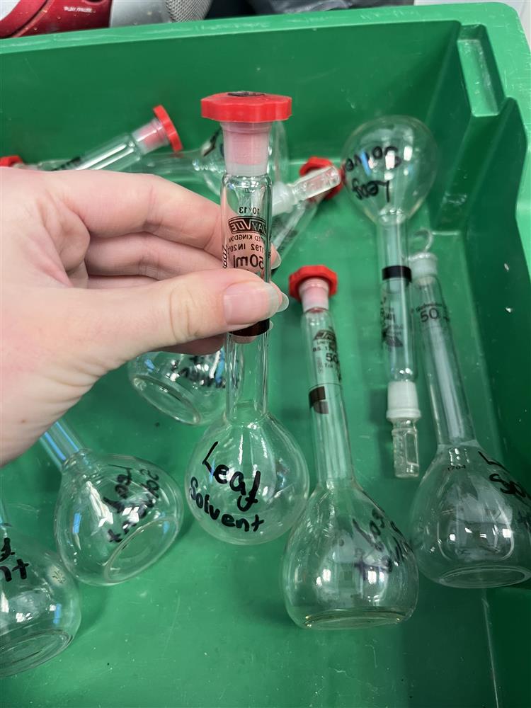 Labelling up lots of volumetrics ready for the leaf solvent! from Jade (Science Technician) (13/03/2026 17:37)