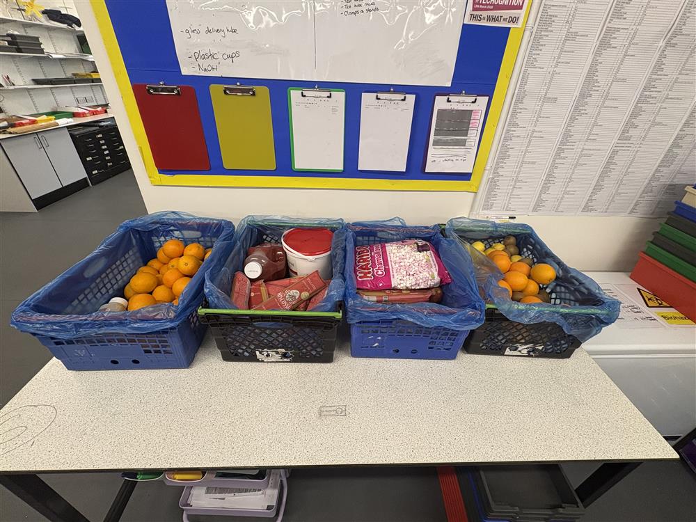 Food stuffs delivery to sort out for next weeks fruit batteries, testing viscosity and tower build from Chloe (Science Technician) (13/03/2026 12:44)