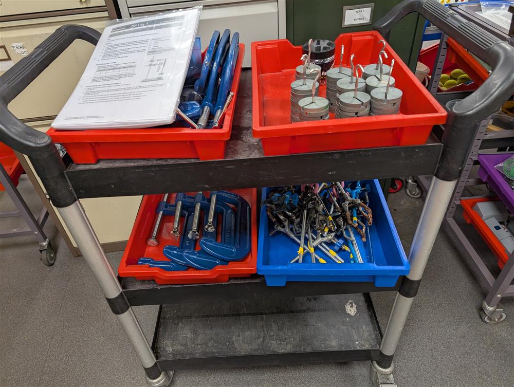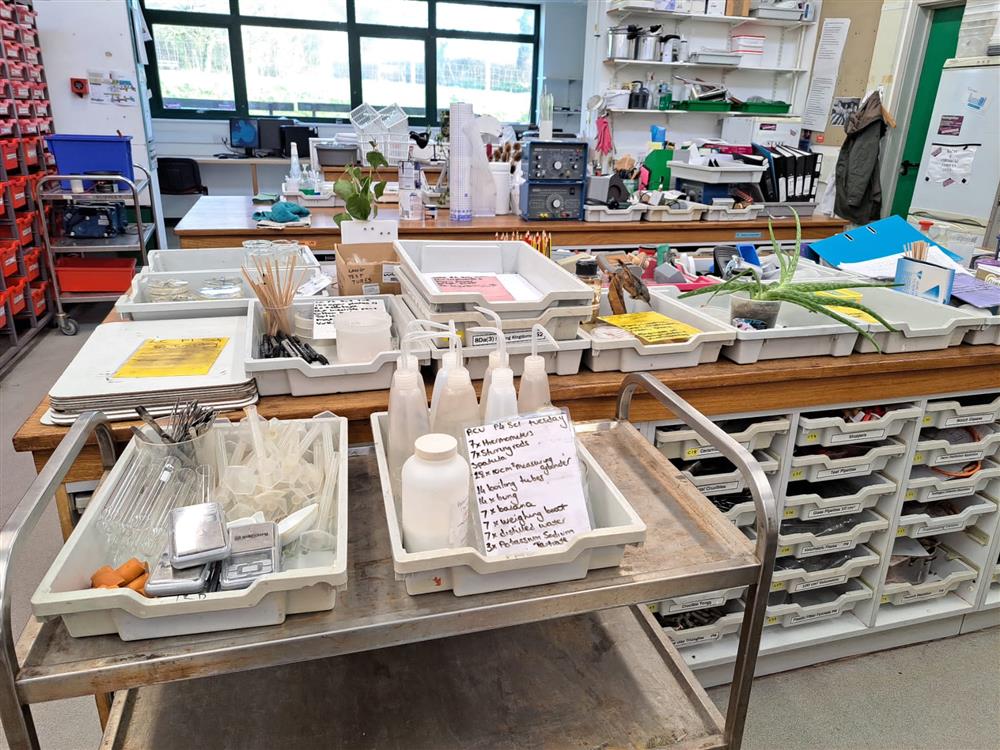 Getting a physics practical ready in our physics prep room with a colourful array of gratnell trays from Kayleigh (Science Technician) (27/03/2025 12:28)